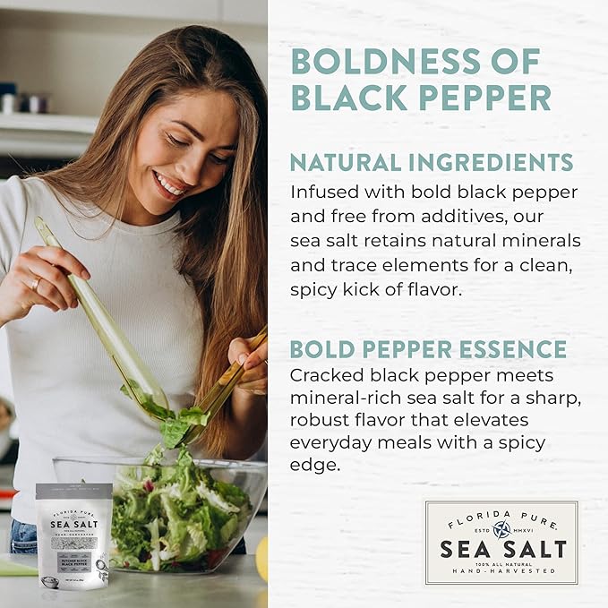 FLORIDA PURE Black Pepper Sea Salt - 80+ Mineral Sea Salt, Natural, Unrefined, Non Iodized - for Baking, Cooking, Seasoning & Enhancing Taste - Rich Taste Flaky Sea Salt (3 oz Pouch)