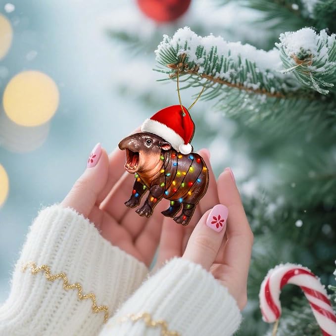 2 Side Printed Flat Christmas Wooden Ornaments, Animal Keepsake Hanging Tree Decoration, Moo Hippo Ornament