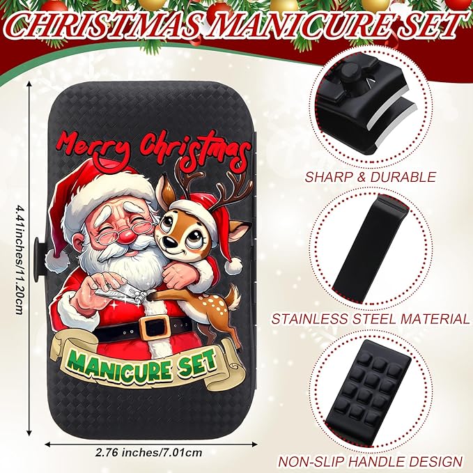 - Funny Christmas Santa Design: our manicure kit's casing features exquisitely customized Christmas designs; The image design depicting Santa Claus trimming the nails of his reindeer undoubtedly evokes a rich Christmas ambiance for people; This Santa themed manicure set combining festive fun with practicality is just the stocking stuffer that you need