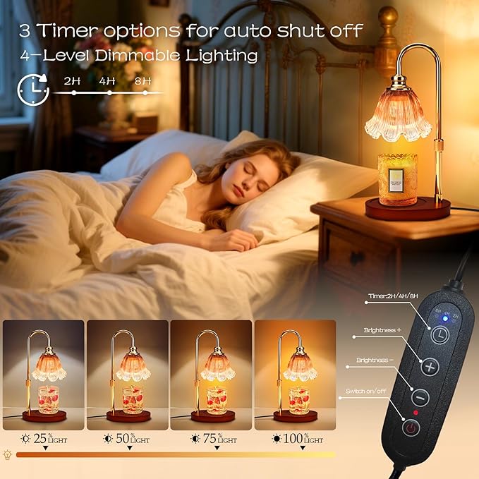 - [Intelligent Timer, Safe and Energy Saving]: The candle warmer lamp with a timer has a user-friendly auto shut-off timer with 3 smart settings (2h/4h/8h). The 2 - hour setting helps you relax after a busy day, the 4 - hour one ensures even wax melting at night, and the 8 - hour setting keeps you warm and cozy all night. Due to the automatic shut-off feature of our candle warmer lamp, it can make you safer and save energy