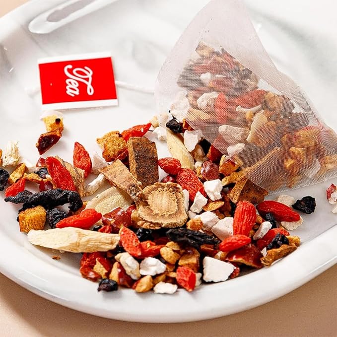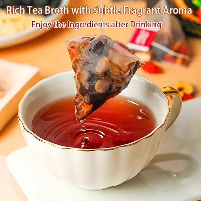 - 【TASTE & TEXTURE】Ginseng Mulberry Gouqi Tea has a mellow taste, and after soaking, you can smell the sweet aroma of red dates and wolfberries, and the tea soup has a deep color. So if you have a sweet tooth, you can add a little honey or rock sugar to taste