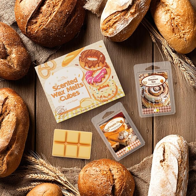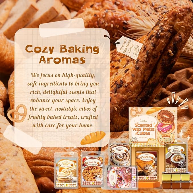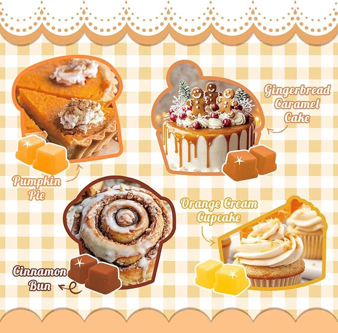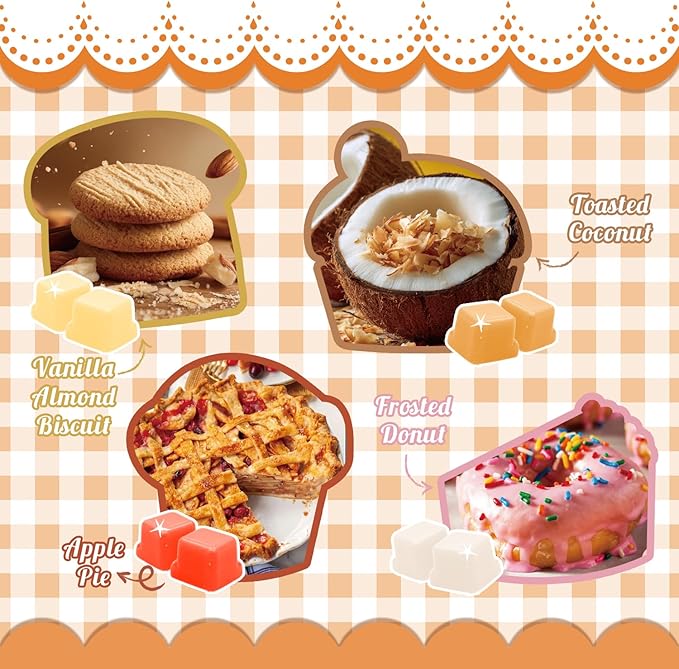 - Bakery-Inspired Scent Collection: Treat your home to the comforting aroma of a fresh bakery with our Bakery Scented Wax Melts. Blending Vanilla Almond Biscuit, Toasted Coconut, Apple Pie, Frosted Donut, Pumpkin Pie, Gingerbread Caramel Cake, Cinnamon Bun, and Orange Cream Cupcake, these wax cubes bring delicious dessert-like scents that make every day feel warm and inviting.
