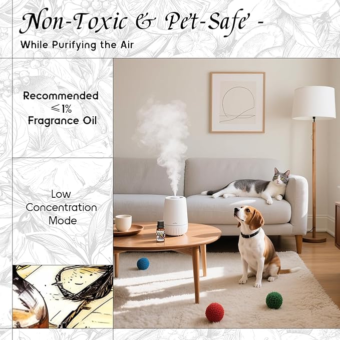 - Pet-Safe Formulation — We carefully crafted to exclude ingredients harmful to pets. Safe for use around pets in low-diffusion modes. It can also be diluted into sprays for pet beds or light DlY care