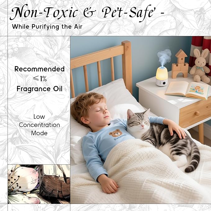 - Pet-Safe Formulation — We carefully crafted to exclude ingredients harmful to pets. Safe for use around pets in low-diffusion modes. It can also be diluted into sprays for pet beds or light DIY care