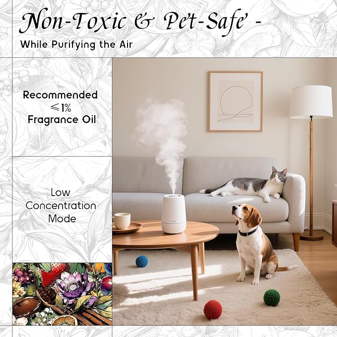 - Pet-Safe Formulation — We carefully crafted to exclude ingredients harmful to pets. Safe for use around pets in low-diffusion modes. It can also be diluted into sprays for pet beds or light DlY care