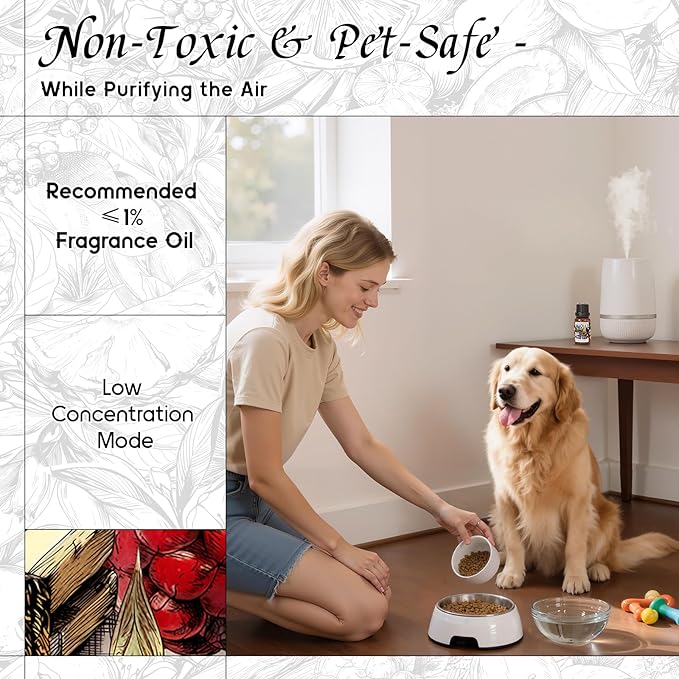 - Pet-Safe Formulation — We carefully crafted to exclude ingredients harmful to pets. Safe for use around pets in low-diffusion modes. It can also be diluted into sprays for pet beds or light DIY care