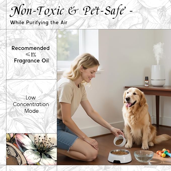 - Pet-Safe Formulation — We carefully crafted to exclude ingredients harmful to pets. Safe for use around pets in low-diffusion modes. It can also be diluted into sprays for pet beds or light DIY care