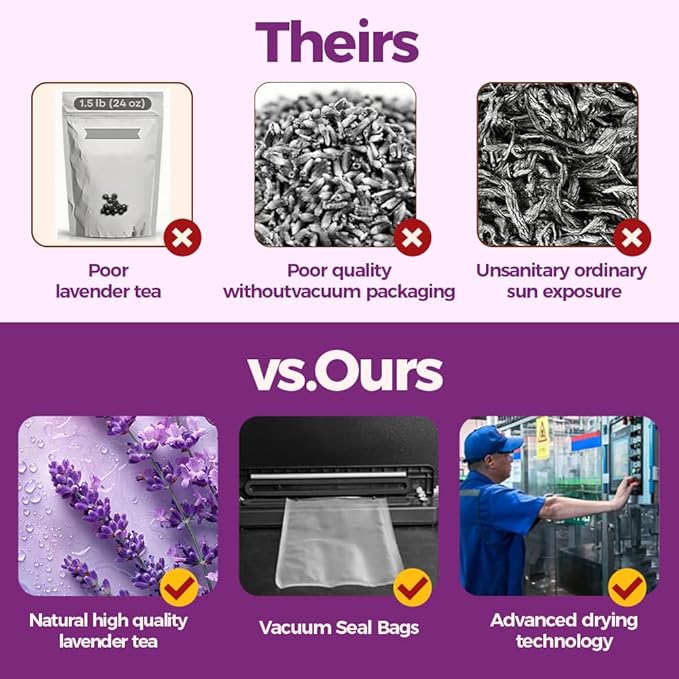 - Premium Lavender Flowers: We carefully select premium, fresh lavender flowers as raw materials, ensuring a pure and natural tea experience. Free from artificial additives or chemicals, each tea bag is filled with hand-picked lavender for a premium herbal tea