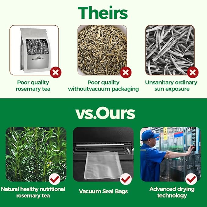 - ☘️ HAND-MADE PRODUCING PROCESSES, NO ADDITIVES: Our Rosemary leaves were processed in a hygienic environment, and then packed in a Re-sealable bag to make a long self-life product, ensure the safety of customers and quality of products. Sugar-Free, Caffeine Free, Gluten Free, Vegan, No Artificial Flavors, No Colors Added.
