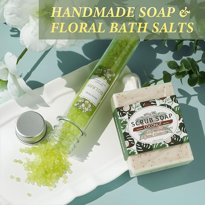 - BATH & BODY CARE: The coconut scrub soap gently exfoliates and moisturizes, leaving skin soft and refreshed after every wash. Bath salts creates a rejuvenating soak that soothes tired muscles and nourishes the body, perfect for unwinding after a long day. Presented in a sophisticated gift box, whether for your mom, wife, girlfriend, best friend, or coworker, this spa gift basket is a memorable way to show love and appreciation on her big day