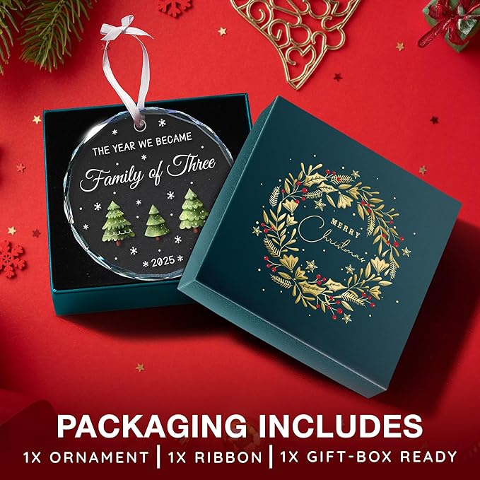 - COMPLETE ORNAMENT SET FOR BABY AND PARENTS – Each set includes a glass, round ornament with beautiful ribbon for hanging and a festive box for gifting. Whether for baby’s 1st christmas ornament or a family christmas gift, it’s ready-to-gift and perfect for a memorable unboxing—ideal for newborn baby girl gifts, baby gifts for new parents, or first time mom and dad gifts.