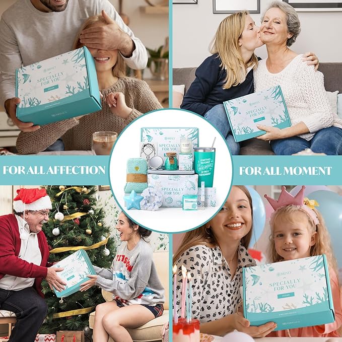 - [Spa Gift Set] Immerse her in coastal tranquility with spa gifts for women. Ocean soap and coconut bath bomb gently cleanse, the ocean-scented candle sets a soothing mood, and blue fuzzy socks provide cozy warmth β making it an ideal birthday gift baskets choice
