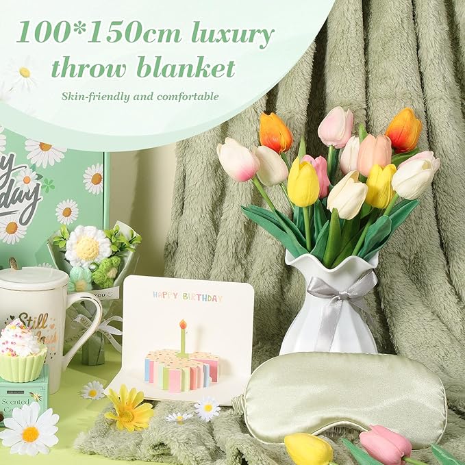 - 【A Complete Self-Care 11-Piece gift basket for Women】Pamper her with everything she needs to unwind! This comprehensive happy birthday gift basket for women includes a cozy fleece blanket, a calming aromatherapy candle, relaxing bath salts, a nourishing handmade soap, a practical makeup pouch, a heartfelt birthday card, a stylish ceramic mug, and a delicate bracelet. It's the ultimate self care gifts for women package designed for total pampering.