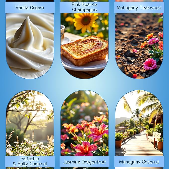 - 【Variety of Long-Lasting Aromas】Our exclusive collection features six beloved scents that fill your car with distinctive atmospheres. From the warm comfort of Vanilla Cream to the vibrant celebration of Pink Sparkle Champagne, each fragrance offers a unique olfactory journey. The set includes the sophisticated Mahogany Teakwood, indulgent Pistachio & Salty Caramel, exotic Jasmine Dragonfruit, and tropical Mahogany Coconut, ensuring a consistently engaging environment throughout your drive.