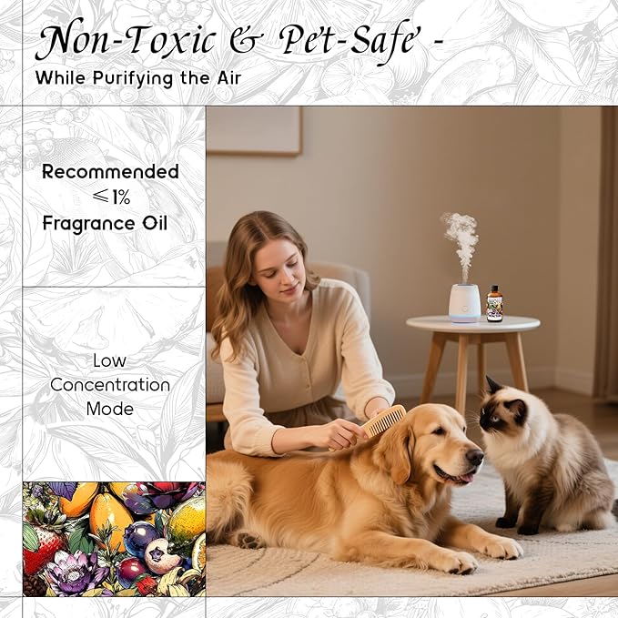- Pet-Safe Formulation — We carefully crafted to exclude ingredients harmful to pets. Safe for use around pets in low-diffusion modes. It can also be diluted into sprays for pet beds or light DlY care