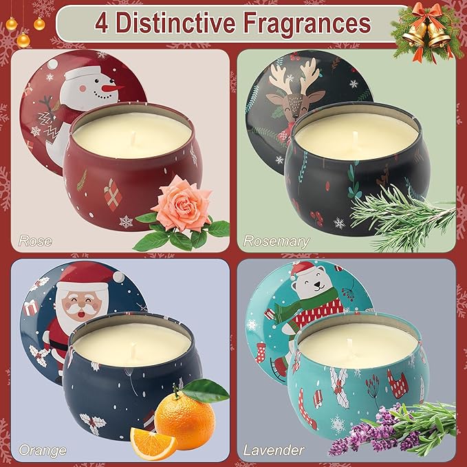 - 【Versatile Scenarios, Strong Aroma】 Christmas Soy candles scented in a tin are easy to carry, Christmas candle gift sets are suitable for use in a variety of occasions, such as reading, meditation, yoga, bathing, sleeping, dating, votive and other social occasions, aroma candles create a lingering, rich ambiance, adding texture to every moment, whether for personal relaxation or social gatherings.
