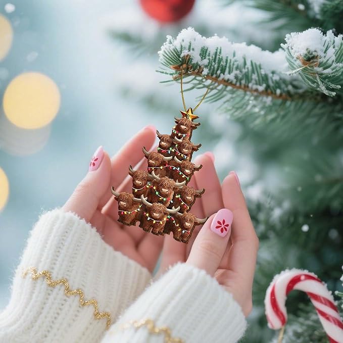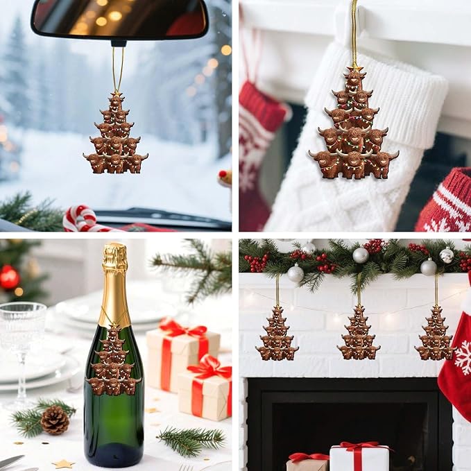 Highland Cow Christmas Tree Wooden Ornament – Cute Farm Animal Holiday Decor for Tree, Gifts for Cow Lovers, Rustic Wooden Christmas Decoration