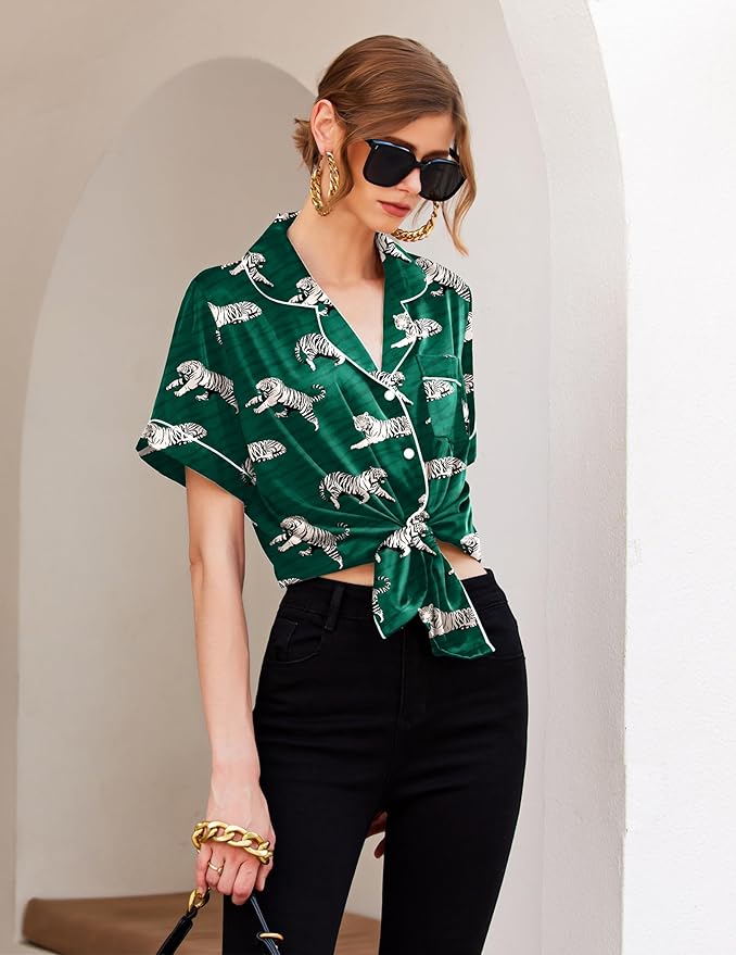 • Elegant design:Short sleeve pajama tops, button down front,notch lapel collar and one chest pocket.Matching pajama shorts for women with stretchy elastic waist that fits for any body size.Lightweight and Breathable,perfect for sleeping, lounging, or morning coffee in effortless grace