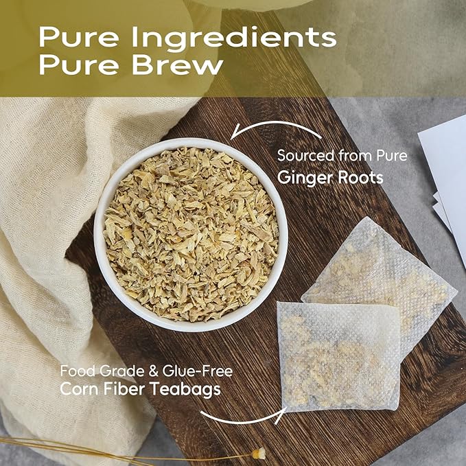FullChea - Ginger Tea Bags, 1.5g*100 Counts - Pure Ginger Root Tea to Soothe & Invigorate - Non-GMO, Caffeine-Free, Support Digestion & Boost Immunity