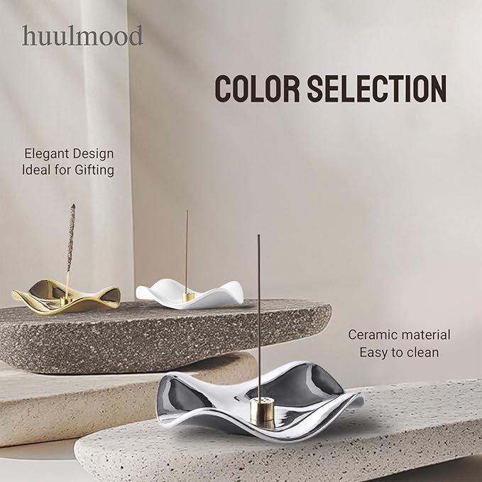 - Unique Design & Premium Material These Incense Holders Feature a Sleek, Wave - Shaped Ceramic Base Paired with a Solid Brass Stick Holder. The Combination of Smooth Ceramic (Available in Gold, Silver, or White Finishes) and Durable Brass Creates an Elegant, Modern Look that Elevates Any Home Decor. Perfect for Displaying Incense Sticks While Adding a Touch of Sophistication to Your Space