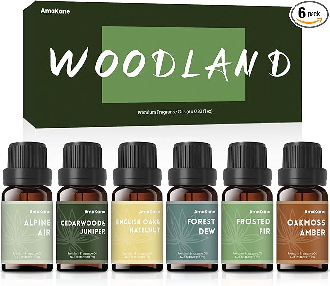 AmaKane Woodland Fragrance Oil, Forest Diffuser Oil Scents, Candle Scents for Candle Making, Soap Making Scents, Frosted Fir, Cedarwood&Juniper, Oakmoss Amber and More Essential Oils 6x10ml