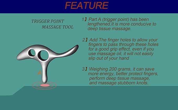 - This Trigger Point Massage Tool is carefully designed,It is more in line with ergonomic structures,Make it easier for you to grip and massage accurately.And according to the size of the hand, the trigger point has been lengthened, which is more conducive to deep tissue massage.At the same time, finger holes have been added, allowing you to pass your fingers through the holes for a good grip,Even if you use massage oil, it won't easily slip out of your hands