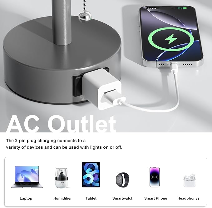 - Bedside Lamps Set with Practical AC Outlet - This modern bedroom lamps kit provides a convenient AC outlet that eliminates the need for additional power outlets, simplifies desktop wiring, and keeps your desk tidy. The two-pin plug is always available for connection to other devices, such as your cell phones, tablets, laptops, humidifiers, smart watch and more, regardless of whether the matching bed lamp is on or off. This compact night lamp is ideal for small office or study environments
