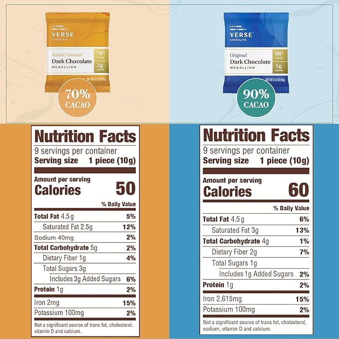 Verse Dark Chocolate Squares Variety Pack - Original and Salted Almond w/Low Cane Sugar, High Cacao - Premium Dark Chocolates - Individually Wrapped Chocolate Squares (9 Count, 2 Pack)