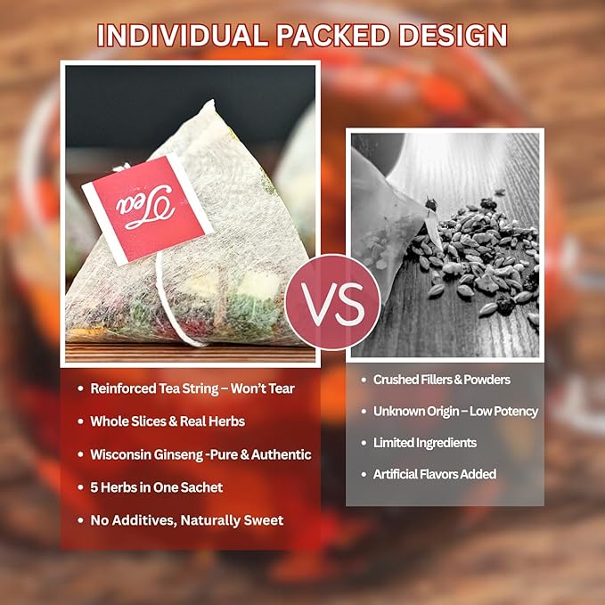 - 【Serving & Storage】This ginseng tea includes 30 pyramid tea bags. Place 1 bag in a cup, pour hot water ≥80°C (176°F), and steep 3–5 minutes. The pyramid mesh lets the herbs circulate for a cup. After opening, tightly reseal any unused bags and refrigerate. Avoid air exposure, which can lead to moisture absorption reduced taste
