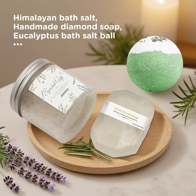 - Relaxing Spa Essentials – Spa Gifts for Women This complete spa gift set for women transforms her home into a soothing retreat. The vanilla coconut candle fills the space with cozy aroma for up to 20h, while Himalayan bath salt, refreshing eucalyptus bath bomb, and diamond-shaped handmade soap offer relaxation, cleansing, and aromatherapy. These spa gifts for women ease stress, promote healing, and recharge body and mind—ideal as birthday gifts for women, pampering gift baskets, care packages for women, or relaxation gift baskets for moms, wife, friends, or coworkers.
