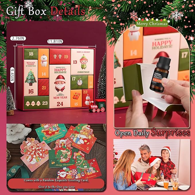 - Advent Calendar of Luxury Fragrances: Still stressing over Christmas gifts? Try our set! This elegant Hotel Fragrance Advent Calendar brings 12 days of festive surprises, including 6 premium hotel-inspired essential oils and 6 random Christmas decorative accessories. Each scent fills your home with warmth, joy, and 5-star holiday charm—making your countdown magical.
