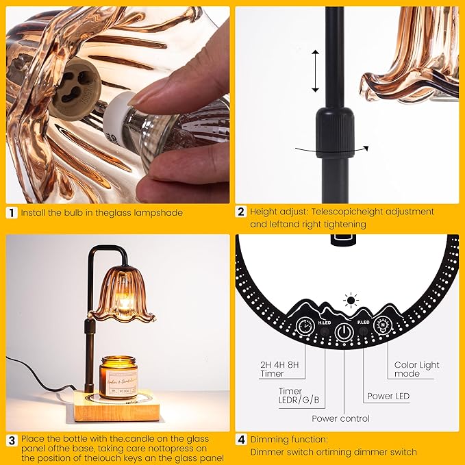 - Adjustable Height & Flower Candle Warmer Lamp:Designed with an elegant floral-shaped glass lampshade and adjustable height stand, this candle warmer lamp fits different sizes of jar candles. It comes with two bulbs included, making it both practical and decorative
