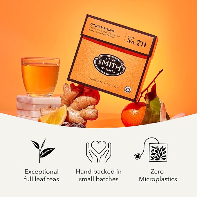 Steven Smith Teamaker Ginger Rising No. 79, Organic Ginger, Lemon, Herbal Tea Blend, Caffeine-Free, Sugar-Free, Sustainably Grown, Tea Bags, 15 Sachets, 1.48oz each