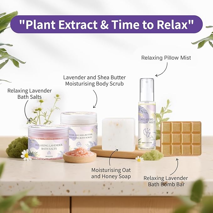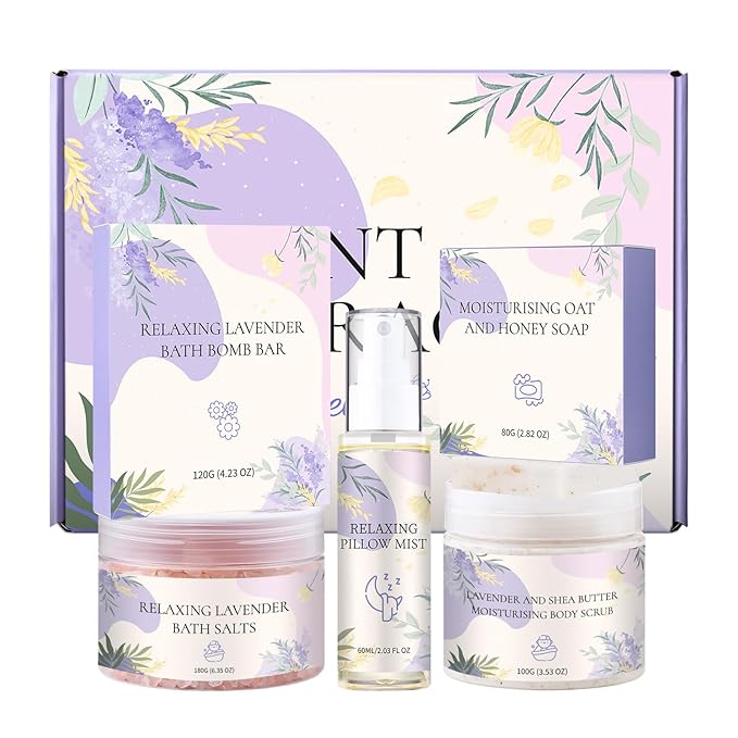 - LAVENDER SPA GIFT SET- The perfect birthday gifts for women who deserve a moment of calm. This set turns any bath into a serene, spa-like escape. It includes lavender bath salts, a shea butter scrub,relaxing pillow mist, moisturising soap, and a lavender bath bomb. Help her unwind and enjoy a luxurious, peaceful retreat right at home.
