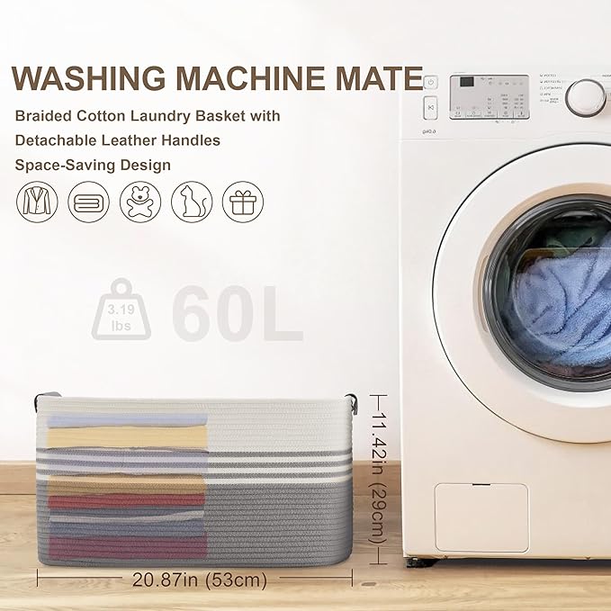 60L Large Laundry Basket with Leather Handles for Living Room Storage, Woven Rope Baskets Bin for Blanket, Kids Toy, Gifts, Wicker Hamper for Bedroom Dirty Clothes, 21"x15"x11" White Grey