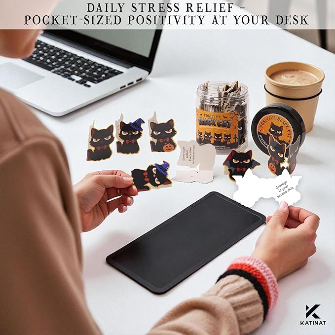 - 🐈 Magical Black Cat Package: Bring home a spooky-cute surprise with the Positive Black Cat Jar. Each set includes 60 chibi black cat–shaped affirmation cards packed in a reusable jar, perfect for Halloween decor or gifting.