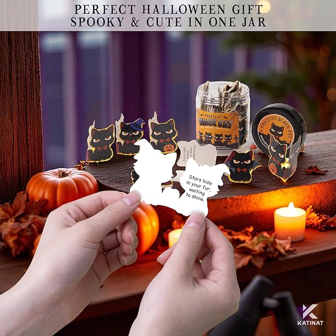 Halloween Black Cat Jar, 60 Cat Affirmation Cards, Halloween Gifts for Women & Teens, Boo Basket Stuffers for Women, Spooky Basket Stuffers