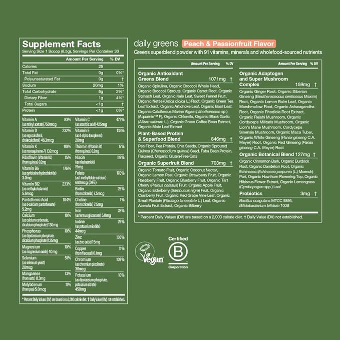 Huel Daily Greens Peach Passionfruit | Superfood Greens Powder | 91 Vitamins, Minerals, and Wholefood-Sourced Ingredients | Adaptogens, Antioxidants, Gut-Friendly Probiotics | 30 Servings