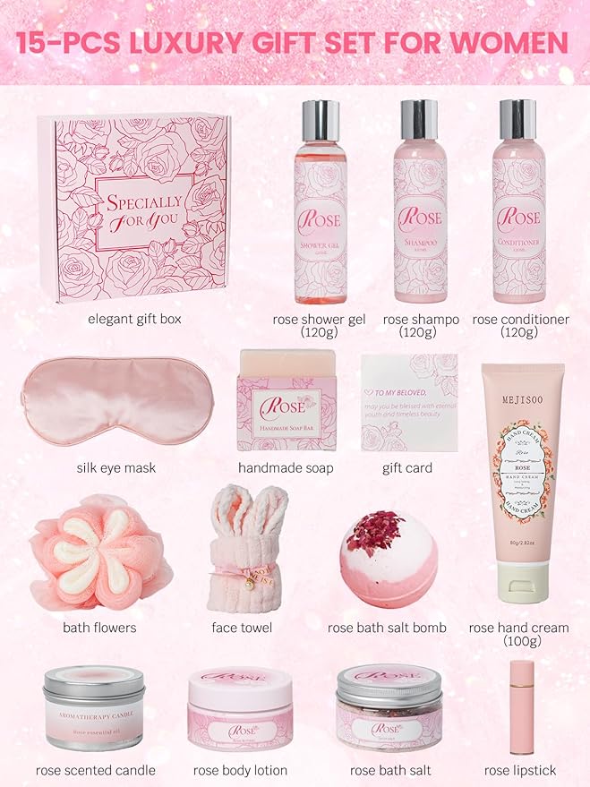 Spa Gifts for Women -15Pcs Self Care Set with Rose Bath & Body Essentials, Mother's Day/Thoughtful Day/Get Well Gifts/Birthday/Christmas/Bridal Shower Gift for Mom, Sister, Wife, Relaxing Home Spa Set