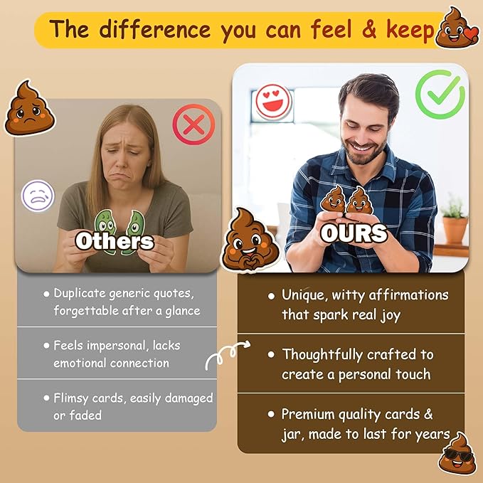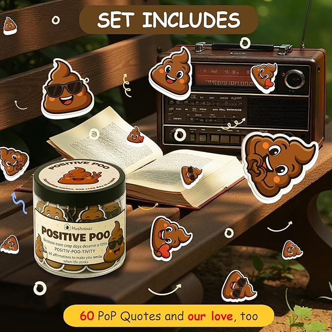 - π© FUNNY POSITIVE AFFIRMATIONS FOR ANY OCCASION β Brighten chaotic days with this quirky Positive Poo Jar, packed with 60 uplifting affirmation cards. Perfect as a gift for women, gift for daughter, or teen girl gift, this unique affirmation jar doubles as a self care gift and daily motivation booster. Loved as a funny gag gift, encouragement jar, or even a gift card book for college student, it brings laughter, joy, and heartfelt support to friends, coworkers, and family.