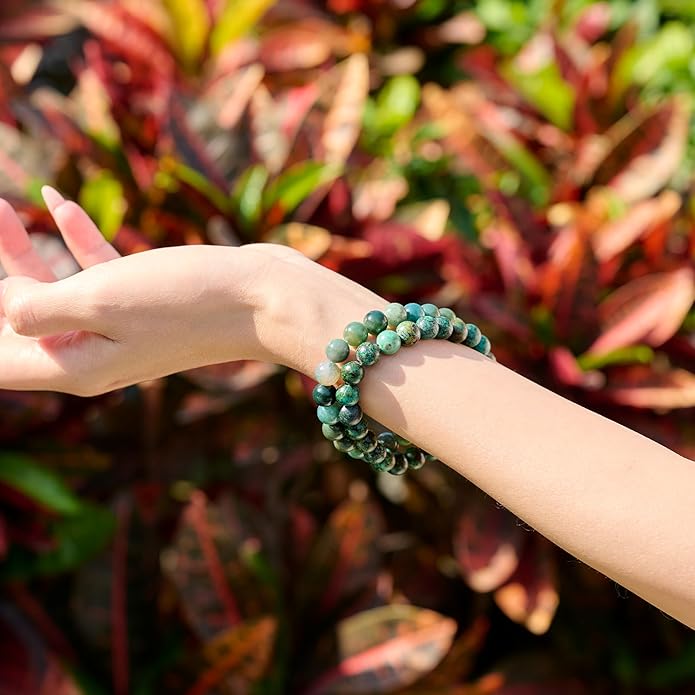 - Growth & Clarity: Moss Agate and African Turquoise inspire personal growth and mental clarity, helping you navigate life’s transitions with confidence and ease. These crystal bracelets are perfect for anyone looking to embrace change and cultivate a deeper connection with themselves and nature
