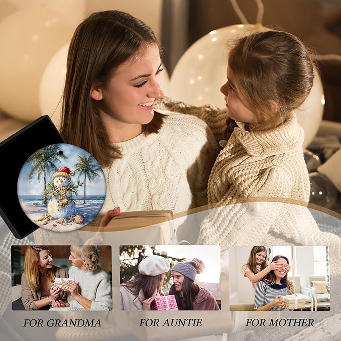 Coastal Summer Christmas Ceramic Ornament Gifts, Ocean Beachy Snowman Christmas Decorative Hanging Ornaments for Xmas Tree Holiday Party Decoration, Coastal Beach Xmas Tree Decorations