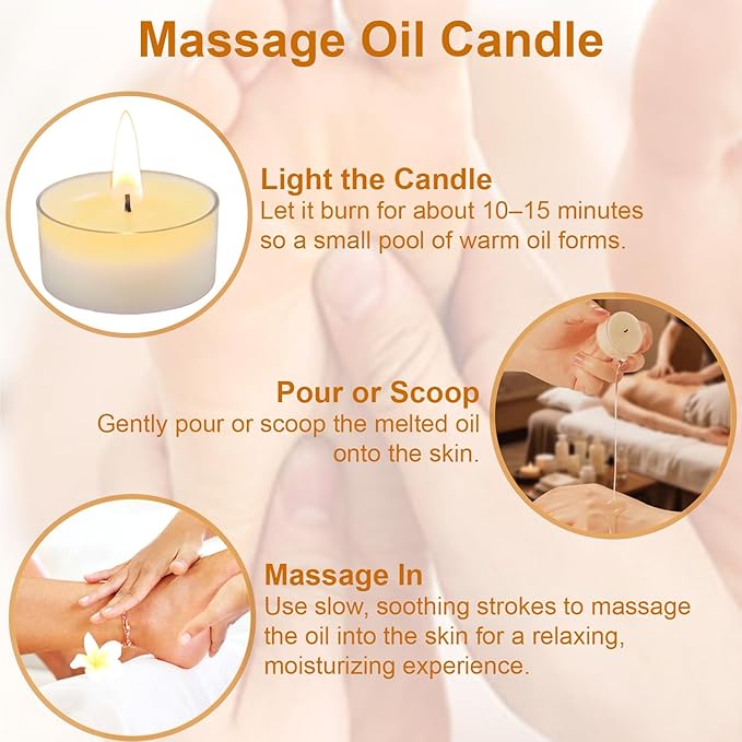 - Step 5 – Relax & Massage with Warm Oil Candle: Light to release a calming spa aroma; once melted, the warm oil nourishes and massages feet to boost circulation and melt away stress.