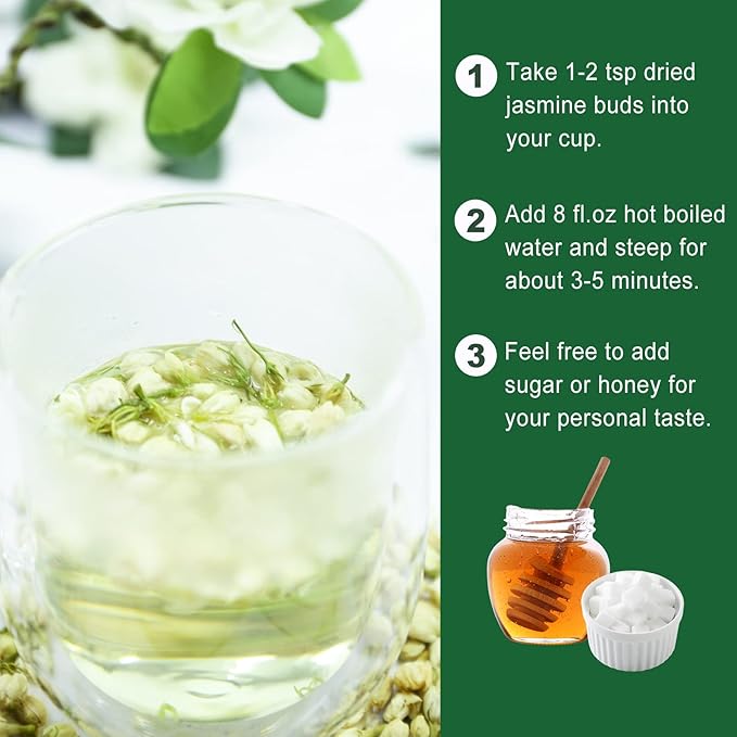 - Freshly Harvest: To make sure to offer you the best drinking experience, each jasmine flower will be picked by hand and dried under precise temperature control. It should be noted that dried Jasmine buds typically smell different from fresh jasmine flowers, as the herbs lose their scent during drying.