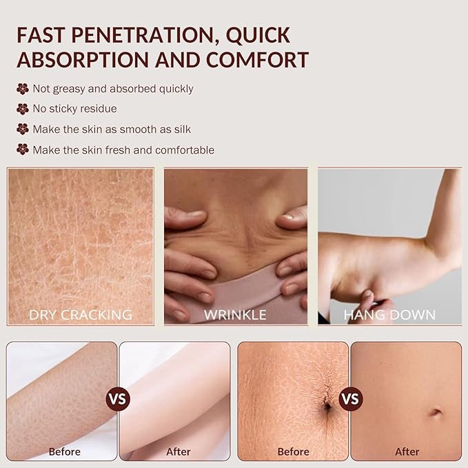 - 【For All Skin Types】--- Gentle and non-irritating body oil is suitable for all skin types. Especially suitable for the abdomen, buttocks, thighs and arms. With continuous use, you will experience significant effects that keep your skin soft and moisturized throughout the day.