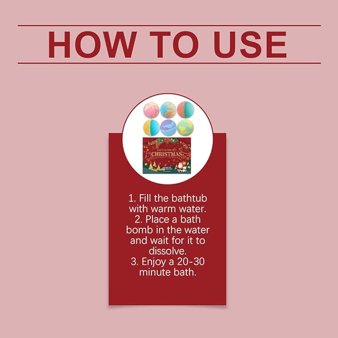 - Christmas Bath Bombs Gift Set: 6 pack lovely Christmas bath bombs enriched with essential oils that create rich bubbles and release essential oil fragrances to moisturize the skin. The fragrance is lavender, rose, rosemary,Lily, Pitaya and ocean.Each bath bomb has been crafted to take you on a sensual journey of relaxation